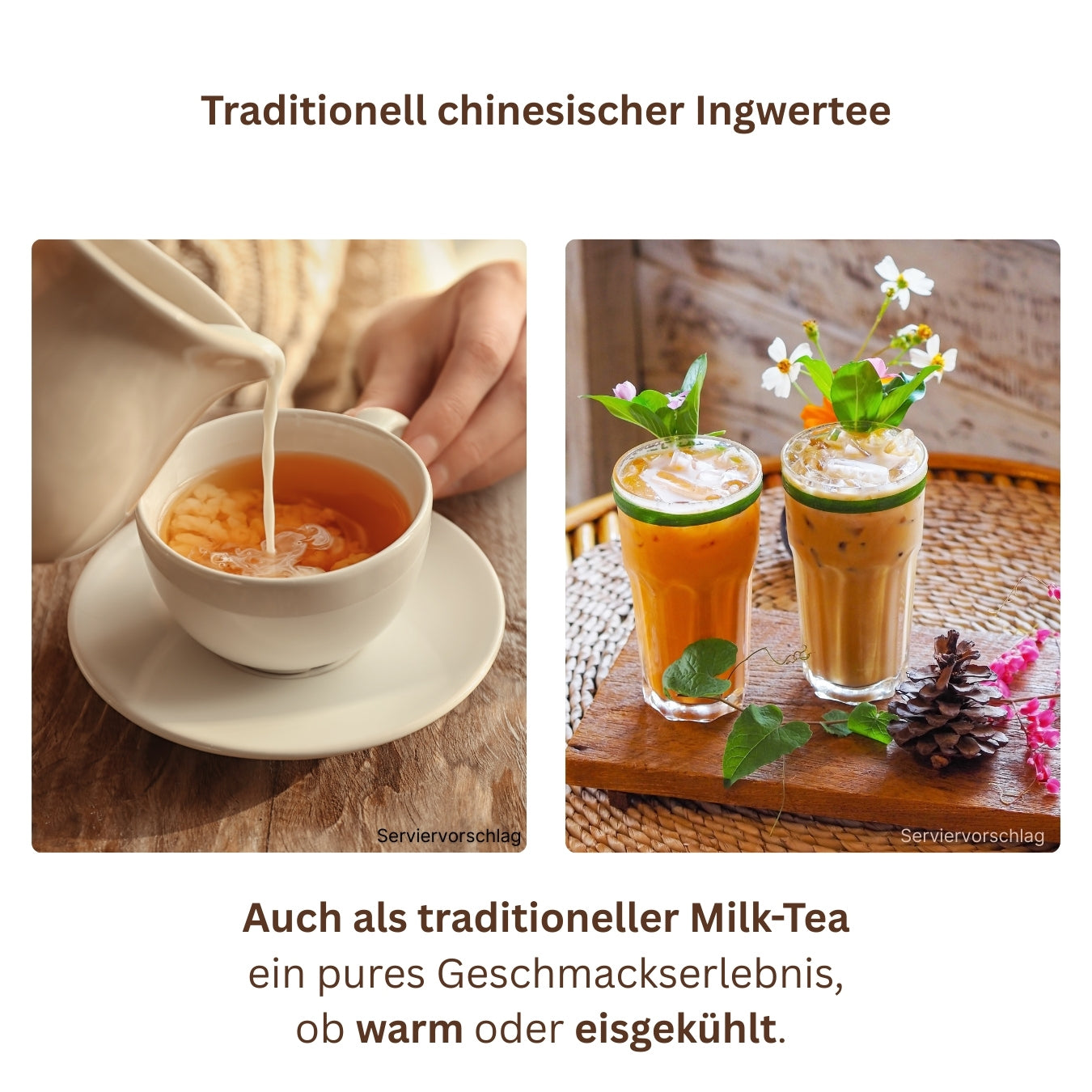 Zarter Zimt-Apfel-Geschmack, leicht süß-säuerlich, köstlicher Ingwergeschmack. Abhängig der Ziehzeit des Tees.Farbe: