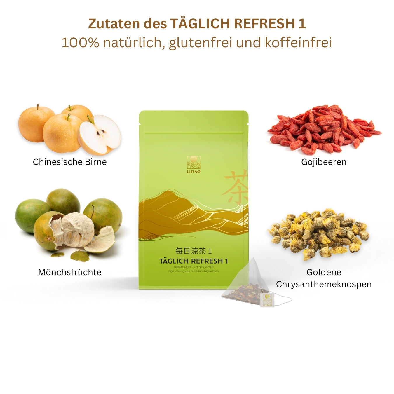 Chinesische Birne, Mönchsfrüchte, Gojibeeren, Goldene Chrysanthemeknospen